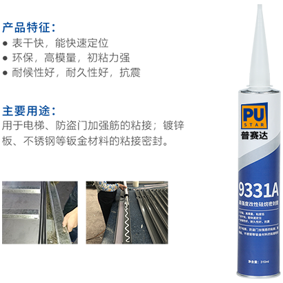 用于电梯、防盗门加强筋的粘接;镀锌板、不锈钢等钣金材料的粘接密封。